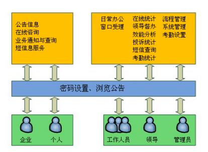 系統(tǒng)平臺提供外網(wǎng)功能,通過與因特網(wǎng)的信息交換,建立政府與企業(yè)和社會公眾之間網(wǎng)上行政審批與監(jiān)察的通道,實現(xiàn)網(wǎng)上咨詢、查詢、申請、審批、投訴、監(jiān)督等業(yè)務(wù)功能;成為真正的網(wǎng)上辦公、辦事的在線服務(wù)平臺,拉近了企業(yè)、居民與政府部門間的距離,強化政府形象。